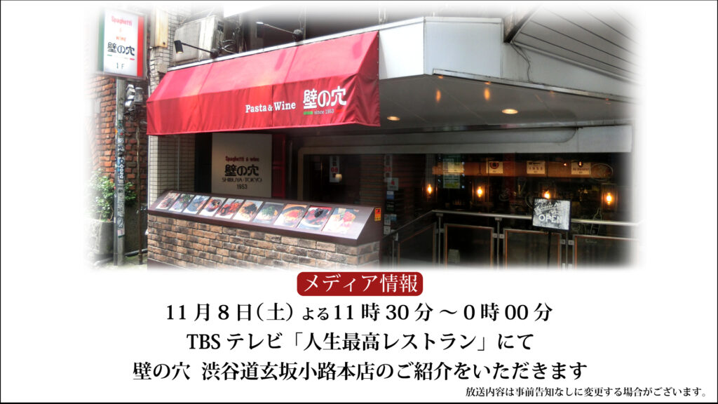 2025.11.05 お知らせ 【メディア情報】11月8日(土) TBSテレビ「人生最高レストラン」にて 壁の穴 渋谷道玄坂小路本店のご紹介をいただきます 11月8日(土)よる 11時30分 ~ 0時 00分 TBSテレビ「人生最高レストラン」にて壁の穴 渋谷道玄坂小路本店のご紹介をいただきます 番 組 名 人生最高レストラン放 送 局TBSテレビ放 送 日11月8日(土)放送時間よる11時30分~0時00分 ■ 人生最高レストランの公式ホームページはコチラをクリックしてください。 投稿ナビゲーション 【表彰】ドミニク・ブシェ トーキョー 伊藤 翔 シェフが「第10回パテ・クルート世界選手権」 日本大会決勝にて優勝いたしました 一覧に戻る