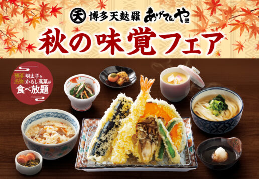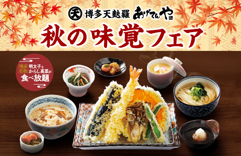 秋野菜、秋刀魚(さんま)、松茸ご飯など旬の味覚のメニューを期間限定でご用意いたしました 販売期間|9月3日(水)~11月30日(日) 博多名物明太子とからし高菜が食べ放題! 秋の天ぷら御膳 天ぷら【旬の秋野菜3種(舞茸...