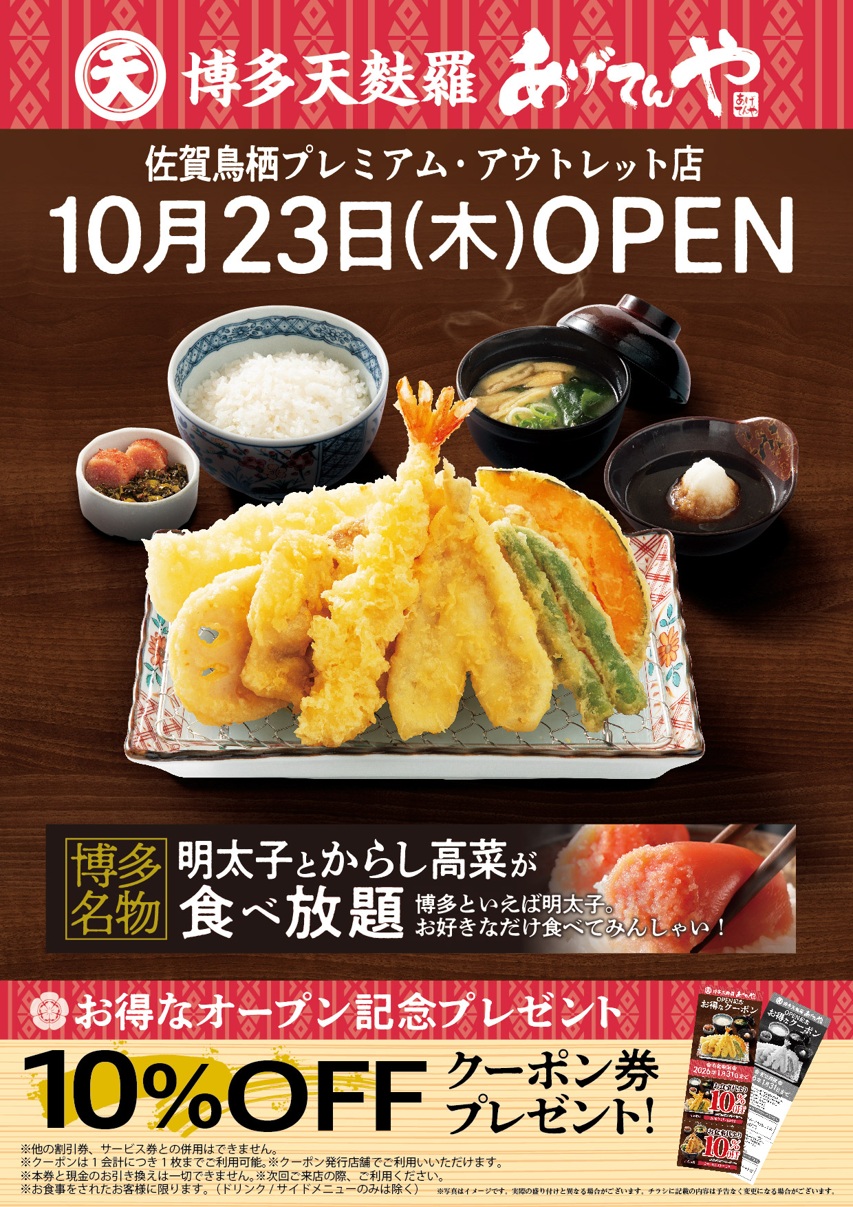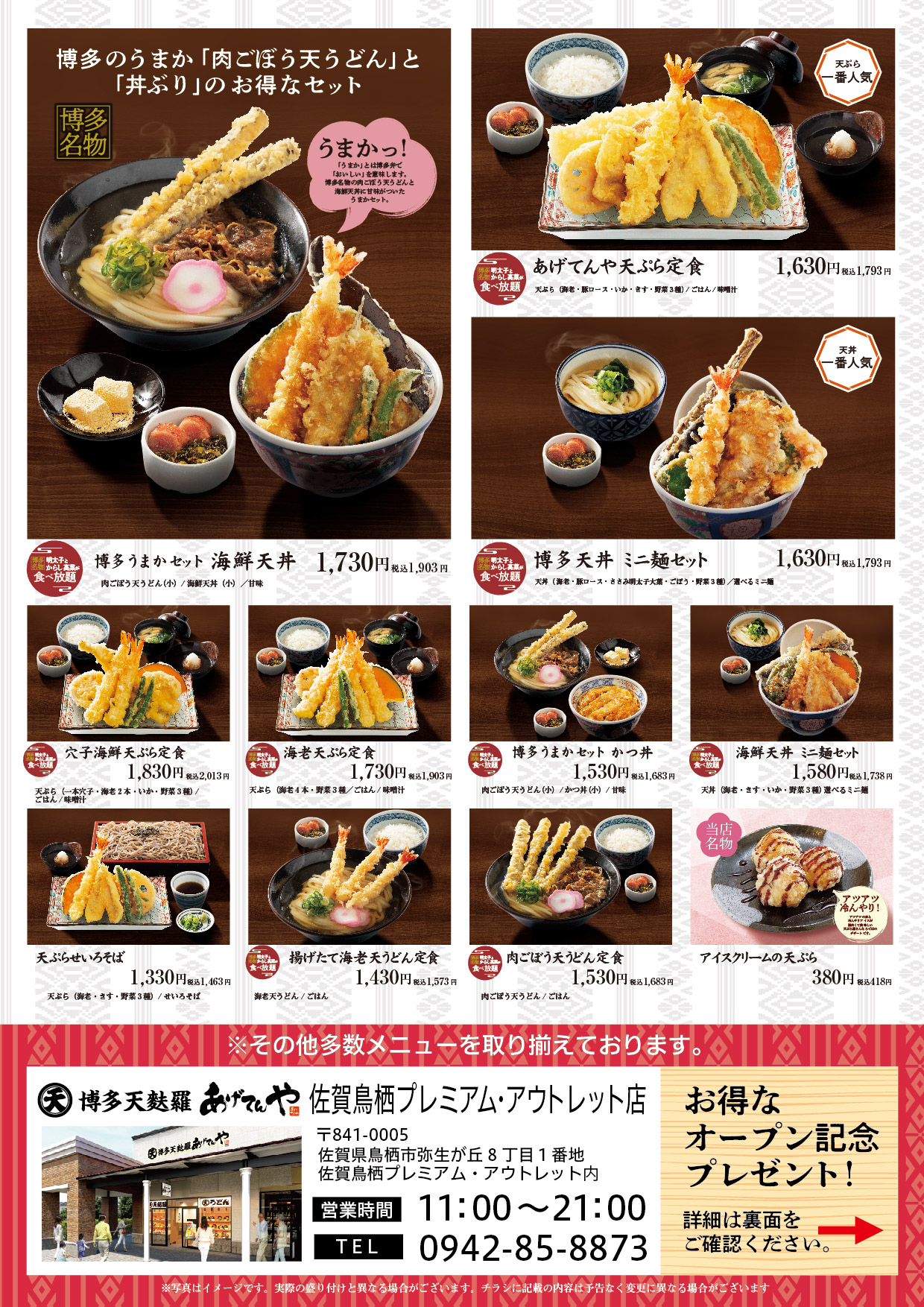 ◎Grand Open!! 10月23日(木) 鳥栖プレミアム・アウトレット店 あげてんや 佐賀鳥栖プレミアム・アウトレット店 店舗情報はこちら 佐賀鳥栖プレミアム・アウトレット店 2025年10月23日 Grand Open! 住所 佐賀県鳥栖市弥生が丘8丁目1番地 鳥栖プレミアム・アウトレット内 TEL 0942-85-8873 営業時間 11:00~21:00(L.O.20:30)
