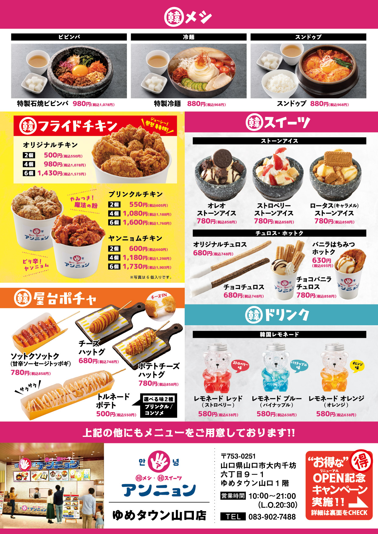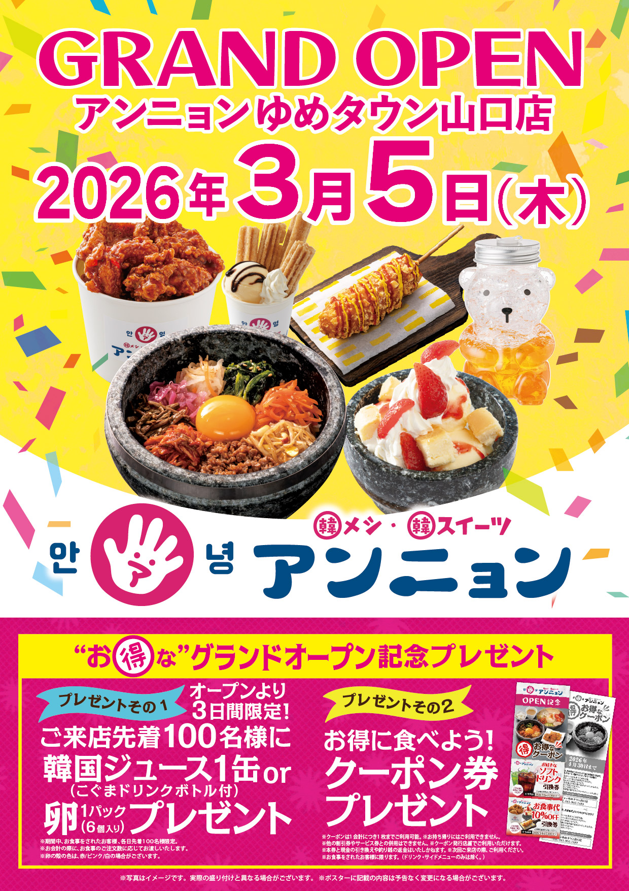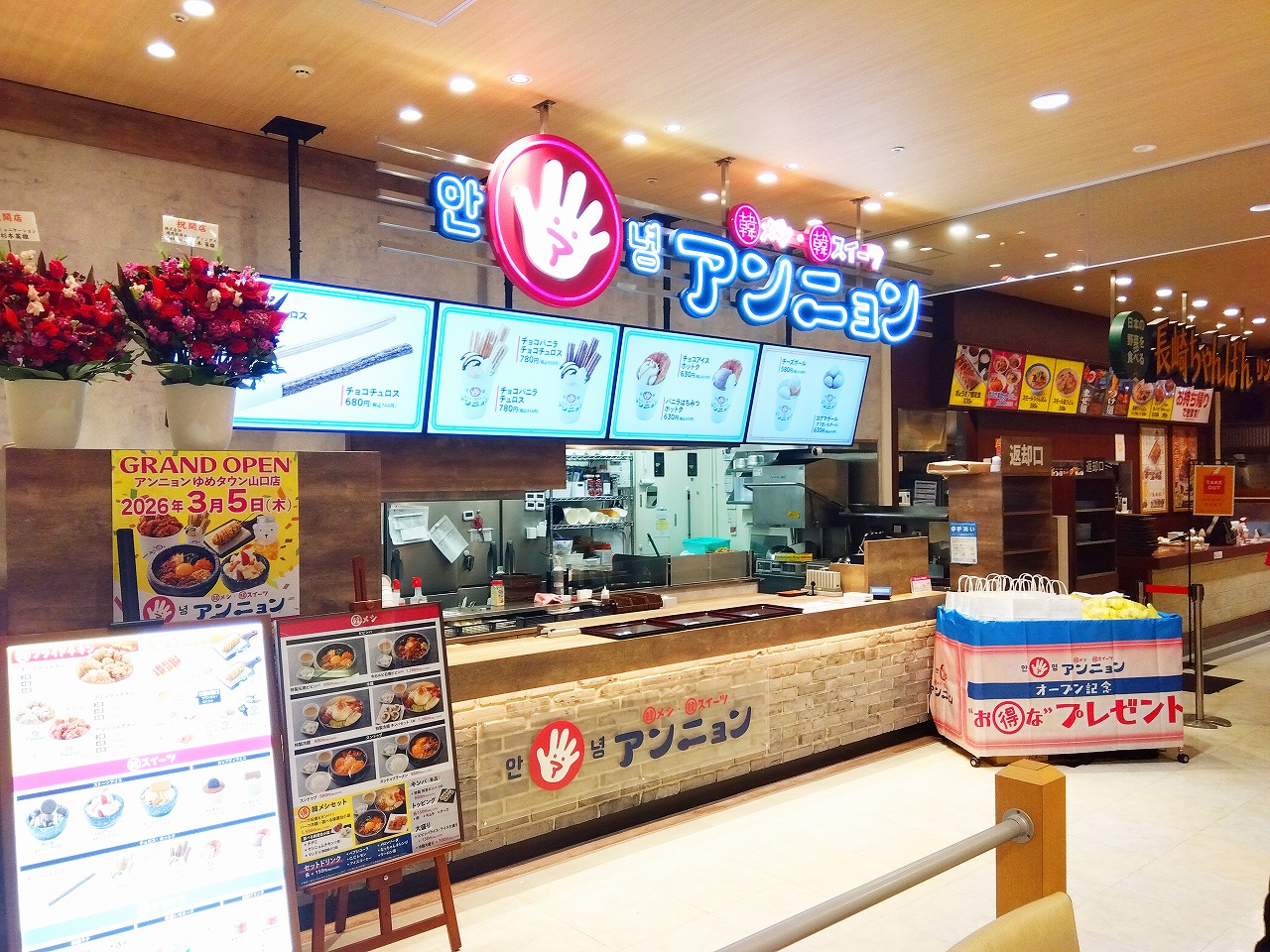 ✨Grand Open|3月5日ゆめタウン山口店 韓メシ・韓スイーツ アンニョン 山口ゆめタウン山口店 山口ゆめタウン山口店 2026年3月5日 Grand Open!! 住所 山口県山口市大内千坊六丁目9-1 ゆめタウン山口1F TEL 083-902-7488 営業時間 10:00~21:00(L.O.20:30) 店舗情報はこちら