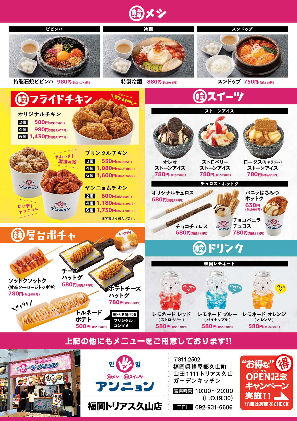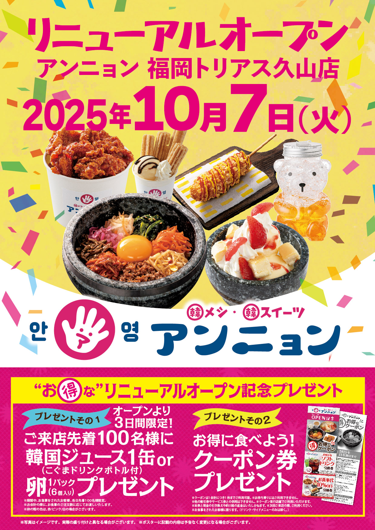 ✨Renewal Open|10月7日トリアス久山店 韓メシ・韓スイーツ アンニョン 福岡トリアス久山店 福岡トリアス久山店 2025年10月7日 Renewal Open!! 住所 福岡県糟屋郡久山町山田1111 トリアス久山ガーデンキッチン TEL 092-931-6606 営業時間 10:00~20:00(L.O.19:30) 店舗情報はこちら