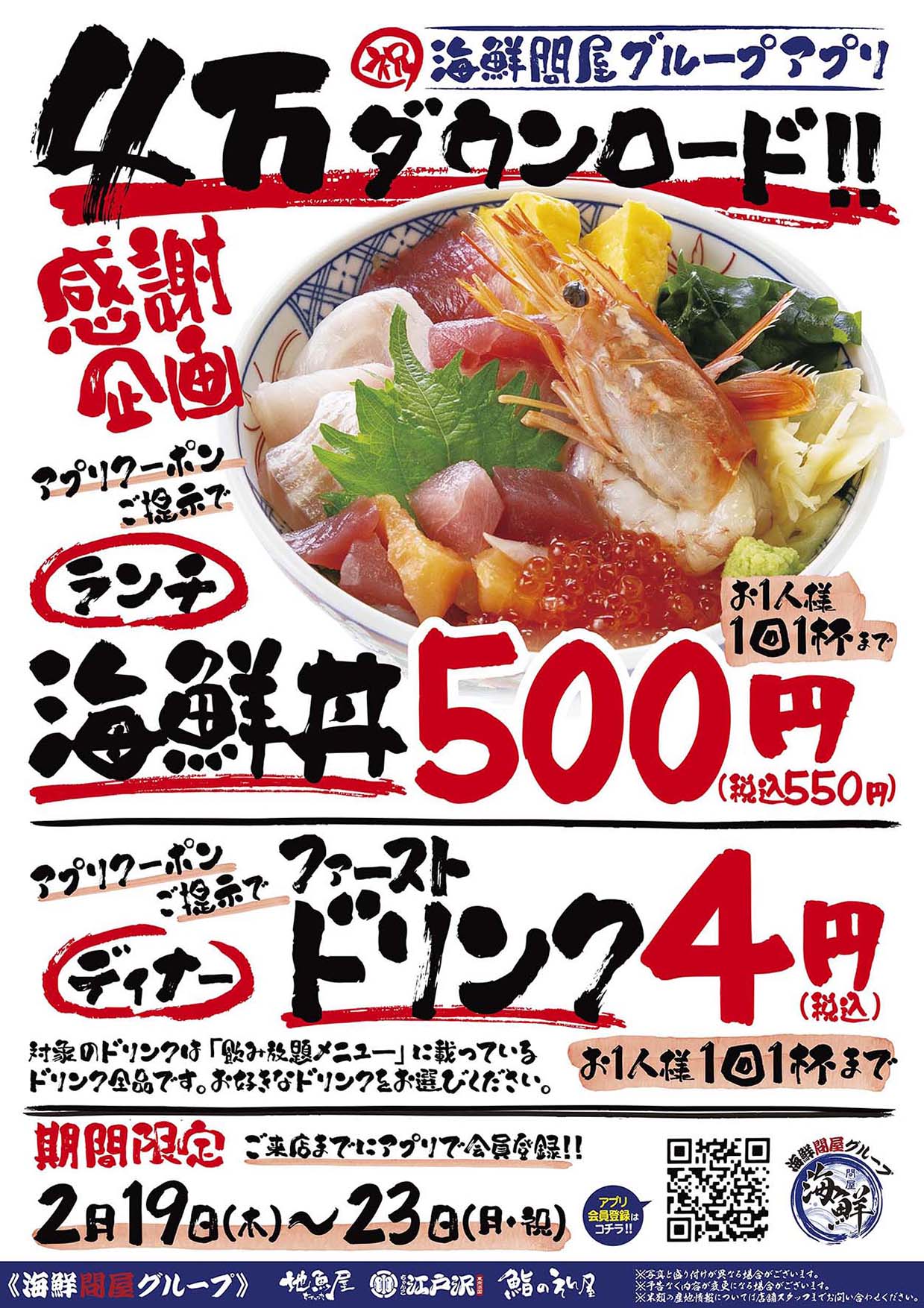 海鮮問屋グループアプリ4万ダウンロード感謝イベント(終了しました) 「ちゃんこ江戸沢」など、東京と埼玉の11店舗をまとめた海鮮問屋グループアプリは4万のダウンロード数を記録いたしました。このマイルストーンを記念いたしまして、2月19日(木)~ 23日(月・祝)まで感謝企画を開催いたします。ランチでは海鮮丼 500円(税込550円)、ディナーでは一杯目のドリンクを4円(税込)でご提供いたします。どちらもご注文時にアプリクーポンをご提示ください。5日間限定のお得なイベントを是非、ご利用ください。皆様のご来店をスタッフ一同、心よりお待ちしております。 【販売期間】2月19日(木)~2月23日(月・祝) ※仕入れ状況により内容が変更になる場合がございます。 ご利用される店舗へのお問合せをお願い致します。