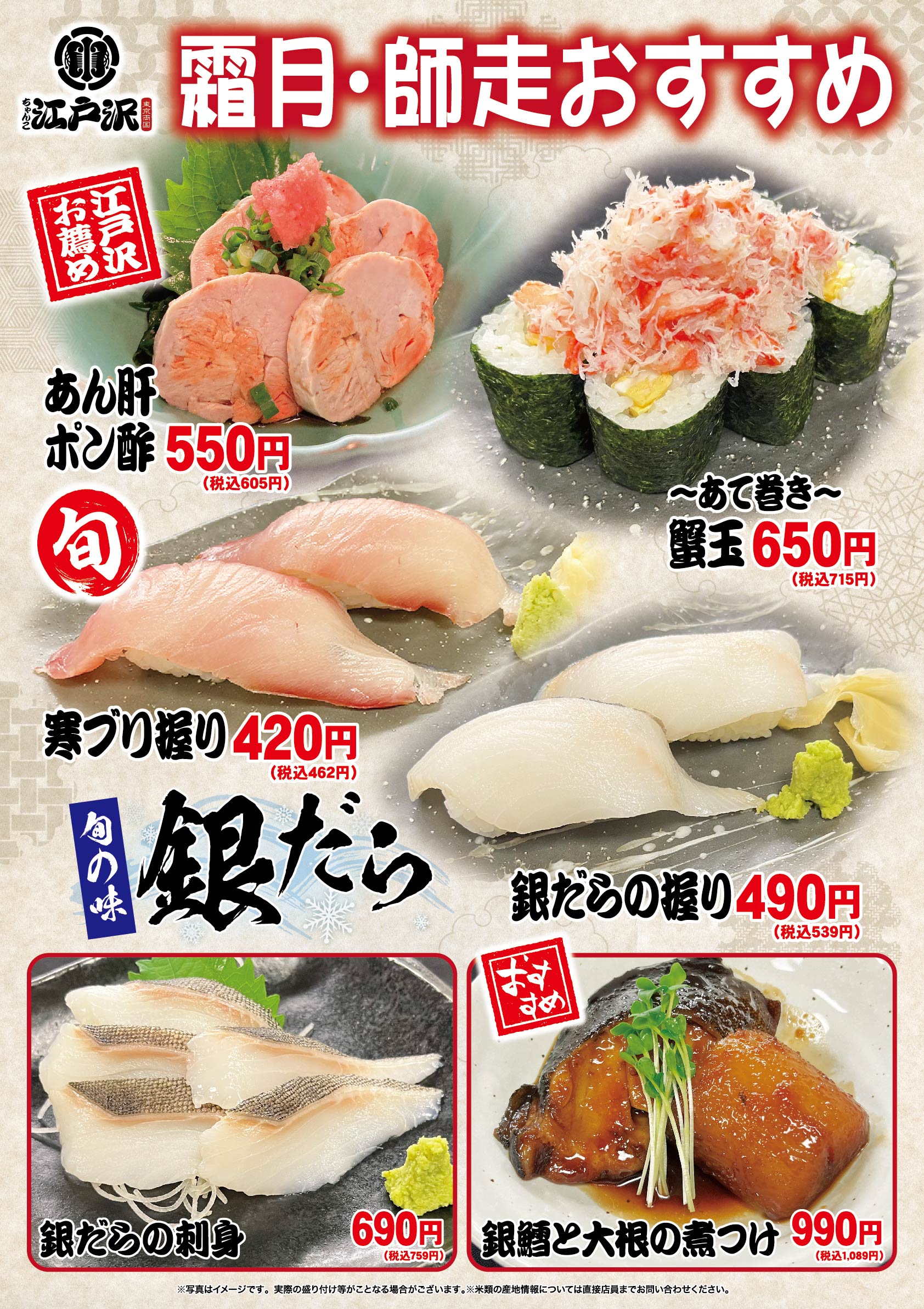 霜月・師走のおすすめ登場(11月・12月) 霜月・師走のおすすめメニューが登場!(11月1日〜)! いよいよ今年もやってきました!冬の味覚が勢ぞろい!! まずは、冬といえば「あん肝ポン酢」。海のフォアグラとも呼ばれる濃厚な味わい “あん肝” をポン酢でさっぱりと召し上がれ。そして、脂が良くのった今が旬の「鰤ブリ握り」に、あて巻きは「蟹玉」寿司を販売します。 また、今が旬の “銀ダラ” を使ったメニューが登場!!素材の美味しさを楽しむなら「銀ダラの握り」「銀ダラの刺身」。こっくり煮込んだ「銀ダラと大根の煮付け」もおすすめの逸品です。 魚介が美味しい冬の旬の味をお見逃しなく。期間限定の美味しさを、ぜひこの機会にご賞味ください。 【販売期間】11月1日〜12月31日 ※年末年始は営業日・営業時間が変更になる場合がございます。 ※仕入れ状況により内容が変更になる場合がございます。 ご利用される店舗へのお問合せをお願い致します。