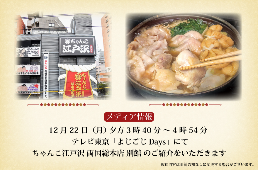 12月22日(月)テレビ東京「よじごじDays」にてちゃんこ江戸沢 両国総本店 別館のご紹介をいただきます 12月22日(月)夕方3時40分 ~ 4時54分 テレビ東京「よじごじDays」にてちゃんこ江戸沢 両国総本店 別館のご紹介をいただきます 番 組 名 よじごじDays 放 送 局 テレビ東京 放 送 日 12月22日(月) 放送時間 夕方3時40分 ~ 4時54分 よじごじDaysのホームページはコチラ>>>よじごじDays 2025 九州場所フェア開催!!(終...