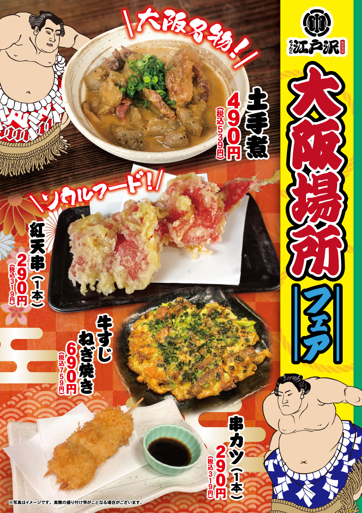 2026 大阪場所フェア開催!! 大阪場所フェア開催!! ~ 土手煮や串カツなど大阪グルメをご用意いたしました ~ 大阪といえば! 土手煮 トロトロしたのど越しのすじ肉と旨みが深くしみ込んだ、濃厚な味わいと、こんにゃくの風味は、どこか懐かしさも感じる味わいです。七味をかけるとやみつき度アップです。 他にも大阪グルメが色々!! 紅天串 農林水産省・うちの郷土料理、次世代に伝えたい大切な味にも選定されている代表的なソウルフード。梅酢の酸味と、ピリッとしたしょうがの辛味がお酒にも合います。 牛すじねぎ焼き 関西ではキャベツの代わりに青ねぎを使ったお好み焼きの一種とも言われる「ねぎ焼き」。甘辛く煮た牛すじとねぎの風味はお酒のおつまみにも最適です。 串カツ 衣がサクサク、中はジューシーなお肉を甘みのあるソースにつけてお召し上がりください。口当たり軽やかで、食べやすいサイズに仕上げました。 期間限定の美味しさを、ぜひこの機会にご賞味ください。 【販売期間】3月8日(日)~ 3月22日(日) ※店舗によって販売時期が異なる場合がございます。 ※仕入れ状況により内容が変更になる場合がございます。 詳しくはご利用される店舗へのお問合せをお願い致します。 店舗一覧