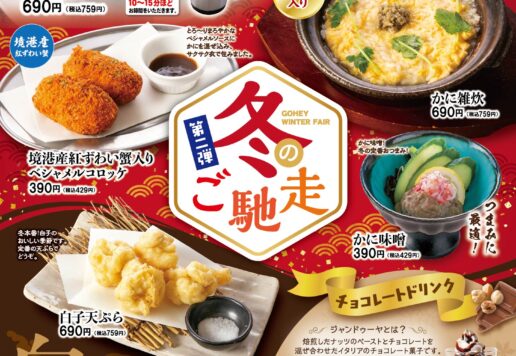「冬のご馳走」第二弾を1 月21 日(水)より期間限定で開催いたします。 冬の贅沢な味わい「ずわい蟹」を釜めしや、雑炊、かに味噌などバラエティ豊かな美味しさで揃えました。 また、まろやかなベシャメルソースに混ぜこんだ「...