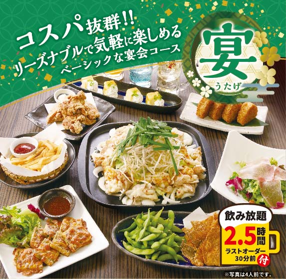 2.5時間飲み放題が付いた宴会コースは3,980円(税込)から!二次会にもぴったり!