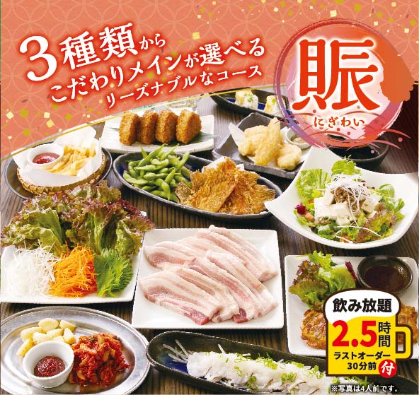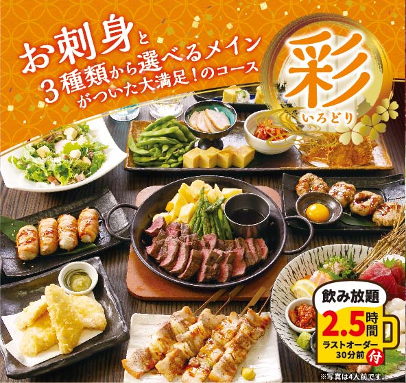 お手頃「宴」コースや、メインが選べる「賑」コース、メインが選べてお刺身もついた「彩」コースに、
