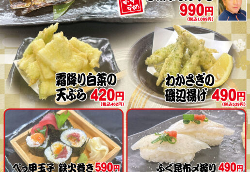 睦月のおすすめメニューが登場! スーパー干物クリエイタープロデュース「さばみりん干し」! 極上のさばみりん干しが味わえるのは今だけ! 白菜を天ぷらにした「霜降り白菜の天ぷら」、お馴染みの「わかさぎの磯辺揚げ」のおすすめ...