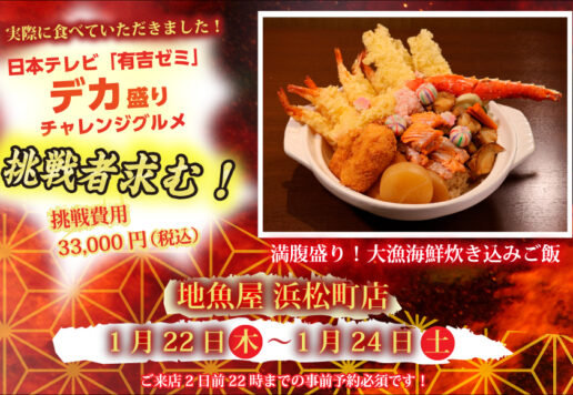 1月19日(月)放送日本テレビ「有吉ゼミ」で地魚屋 浜松町店にて出演者に食べていただきました「デカ盛り」を 地魚屋 浜松町店にて1月22日(木)・23日(金)・24日(土)の3日間限定でご用意いたします。皆さま、どうぞ...