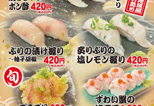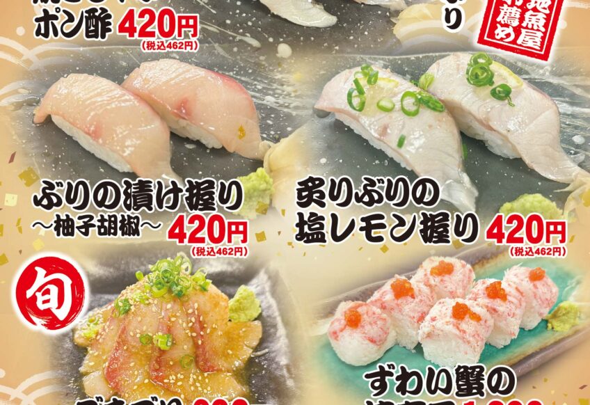 神無月のおすすめメニューが登場! 今月は “鰤(ぶり)” がおすすめ! まずは、鰤の握り握り寿司!「ぶりの焼きしゃぶポン酢(握り)」「ぶりの漬け握り〜柚子胡椒〜」「炙りぶりの塩レモン握り」の3種の握り寿司を販売します。...