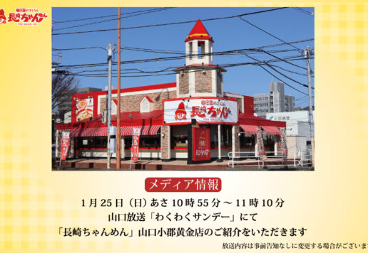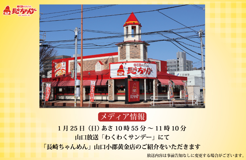1月25日(日)あさ10時55分 ~ 11時10分 山口放送「わくわくサンデー」にて長崎ちゃんめん 山口小郡黄金店の ご紹介をいただきます 番 組 名 わくわくサンデー 放 送 局 山口放送 放 送 日 1月25日(日...