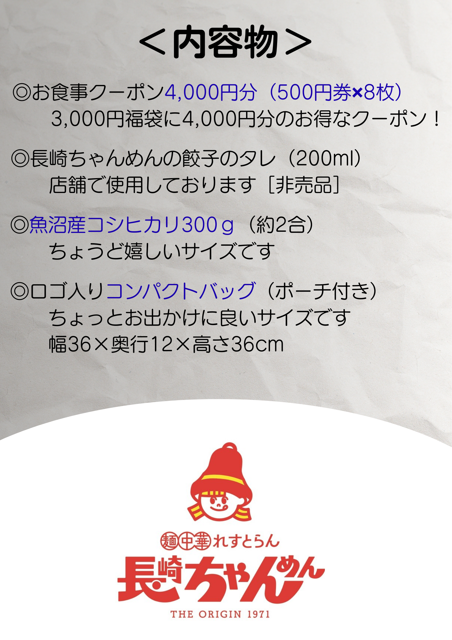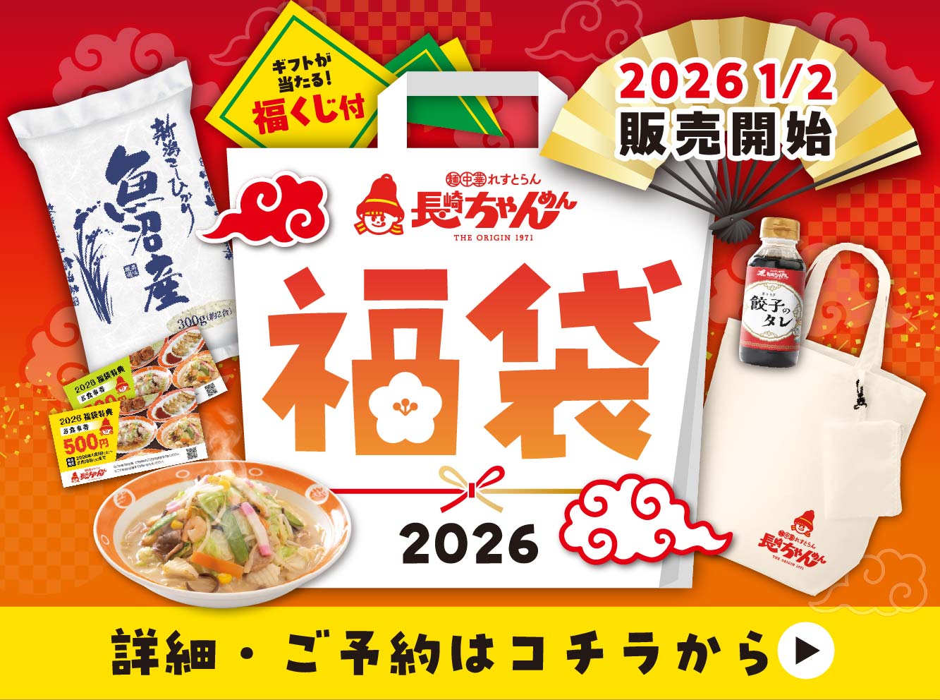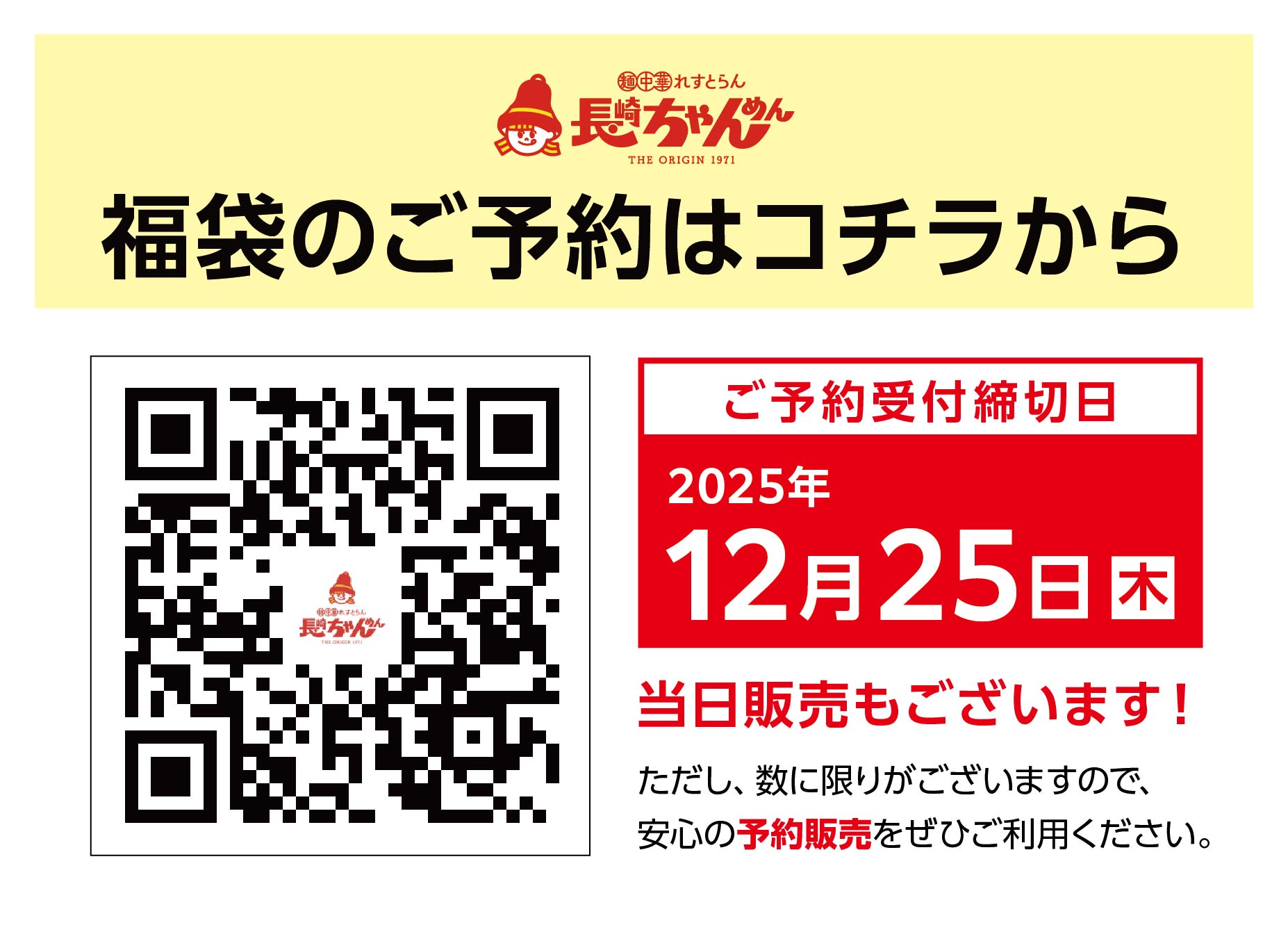 ✨『福袋2026』販売決定!! 2025.12.15 長崎ちゃんめんの✨福袋2026 発売期間:1月2日(金)~1月4日(日)※無くなり次第終了 福袋をご購入のお客様は、1個購入ごとに1回引く『福くじ』 4,000名様にその場で当たるハズレくじなし! この機会に是非ご購入ください♡ ❆事前予約が可能です❆ スマホの方は上記のQRコードを 読み込む、もしくは長押しして、 「リンク”forms.gle”を開く」を クリックしてください。 パソコンからのご予約は コチラから★ ご購入時の注意点 ・店頭販売のみ ・各店舗無くなり次第販売終了です ・お一人様複数購入可能 ・現金/クレジットカード/キャッシュレス決済/株主優待券でのご購入可能 ・株主割引券/GGカード等のご利用はできません