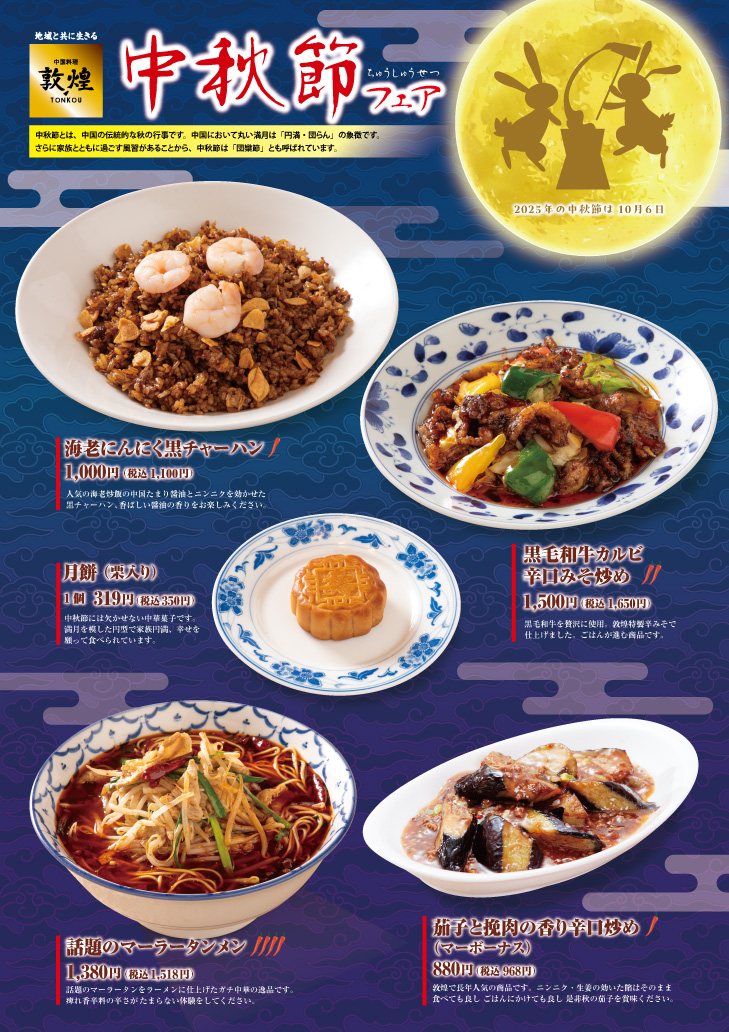 中秋節は中国の伝統的な秋の行事で、満月を眺めながら家族と過ごす大切な日です。中国では、丸い満月は「円満」や「団らん」の象徴とされており、この日に家族が集まることから「団欒節」とも呼ばれています。 皆さまにも、心温まるひとときをお過ごし頂けますように★